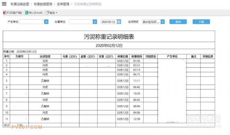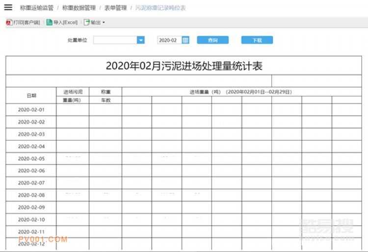 系統(tǒng)可提供各種類(lèi)型表單管理的功能,主要包括污泥稱(chēng)重記錄明細(xì)表、污泥稱(chēng)重記錄噸位表、污泥稱(chēng)重記錄車(chē)數(shù)表、污泥稱(chēng)重記錄匯總表。