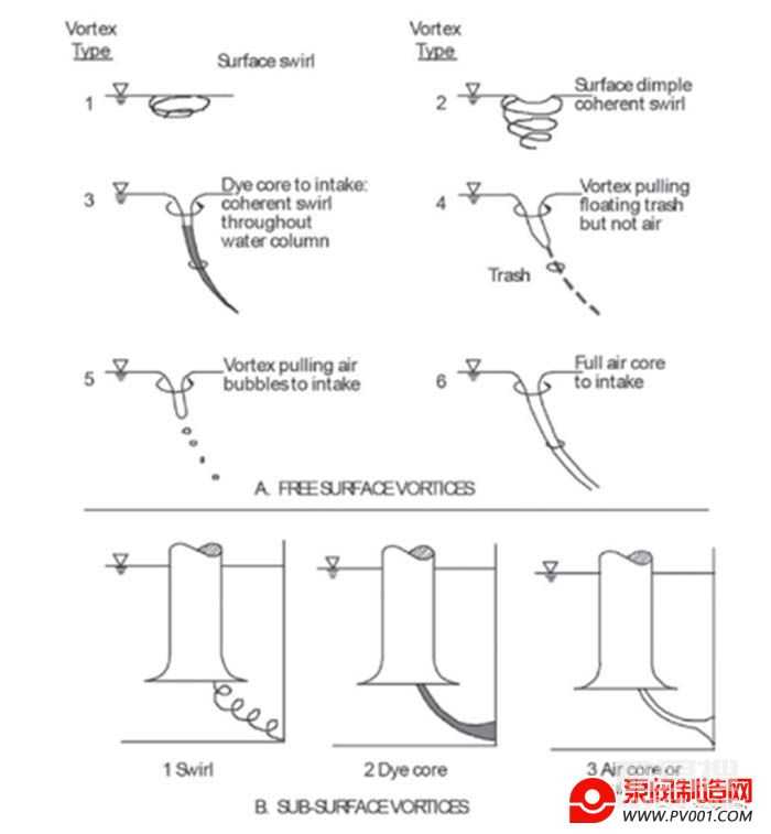 當(dāng)液位下降得太接近泵的吸入口或浸入式吸入管道時(shí),儲(chǔ)罐和濕井中都會(huì)出現(xiàn)自由表層旋渦。當(dāng)出現(xiàn)自由表層渦流時(shí)(見(jiàn)下圖),空氣將進(jìn)入泵內(nèi)。這可能會(huì)造成吸入揚(yáng)程損失并下降泵的性能。在嚴(yán)重的情況下,泵可能會(huì)損壞。由于大多數(shù)離心泵不是自吸式或潛水式,維修人員必須手動(dòng)加注、重新啟動(dòng)和排空泵。此外,過(guò)多的空氣會(huì)損壞機(jī)械密封、填料和葉輪磨損環(huán)。使用簡(jiǎn)單的傳感器或使用自動(dòng)水位系統(tǒng)監(jiān)測(cè)水位將確保泵或吸入管道具有足夠的浸沒(méi)深度。