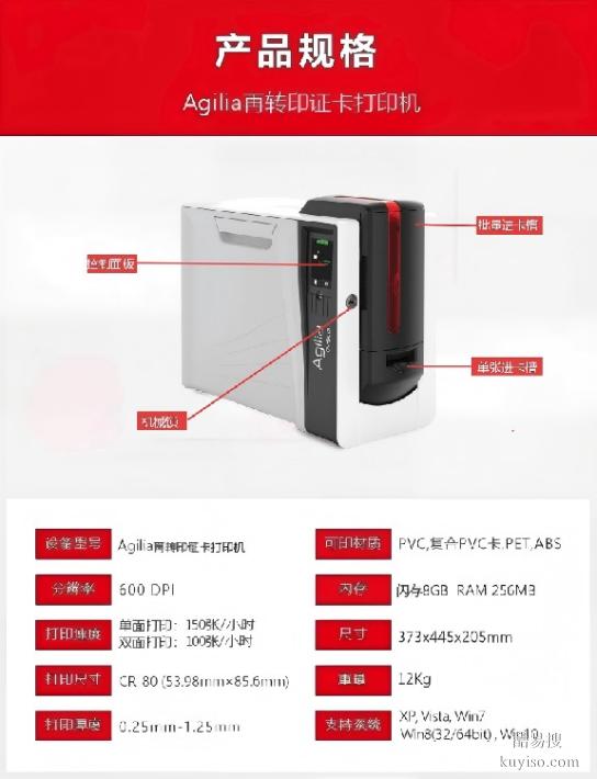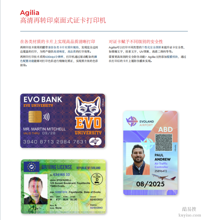 Agilia是Evolis旗下高清再轉印桌面式證卡打印機,采用600dpi再轉印技術實現照片級打印,兼容多種卡片材質。具備微縮文字、防偽膜等多重安全設計,支持磁條/智能卡編碼。單面打印150張/小時,進卡槽200張,適配批量制卡。搭配原裝耗材,3年整機保修及打印頭終身質保,適用于企業(yè)、機構個性化證卡需求。