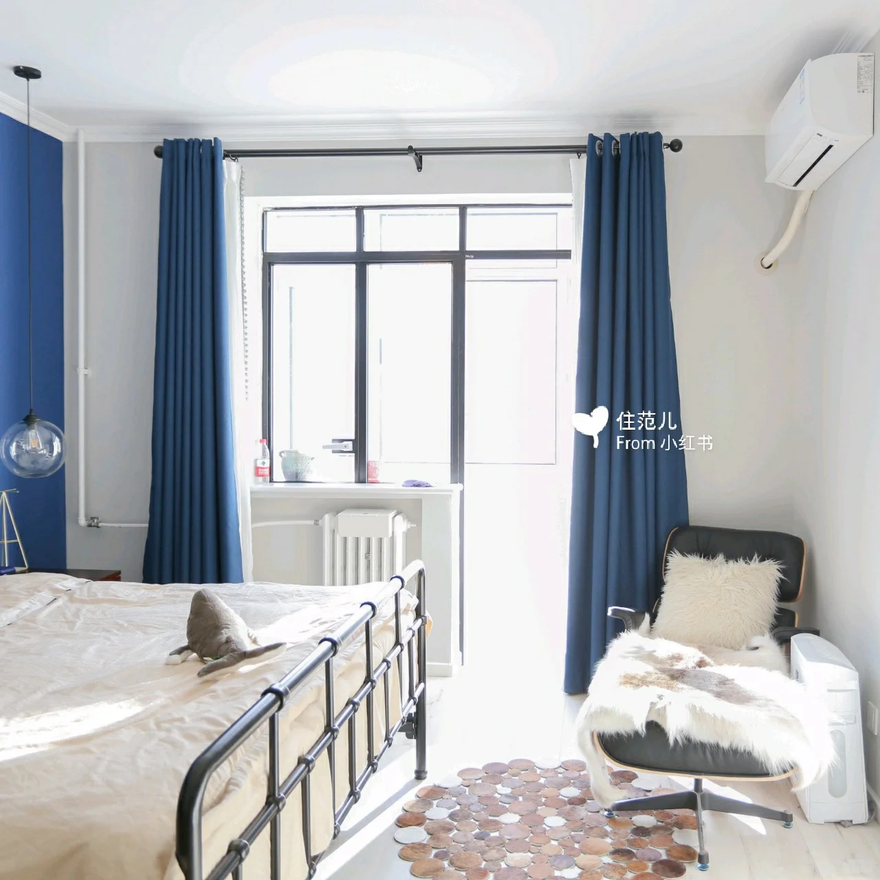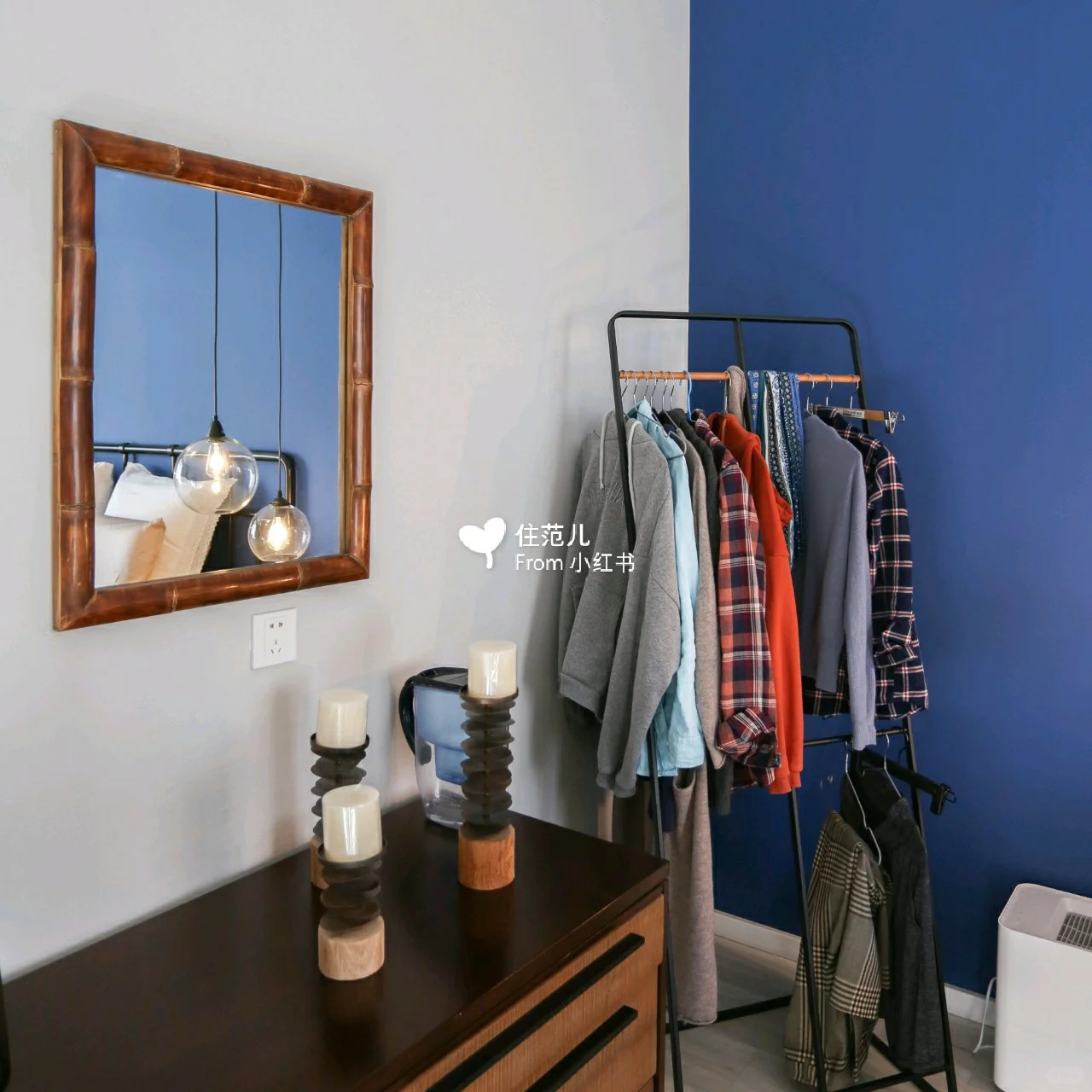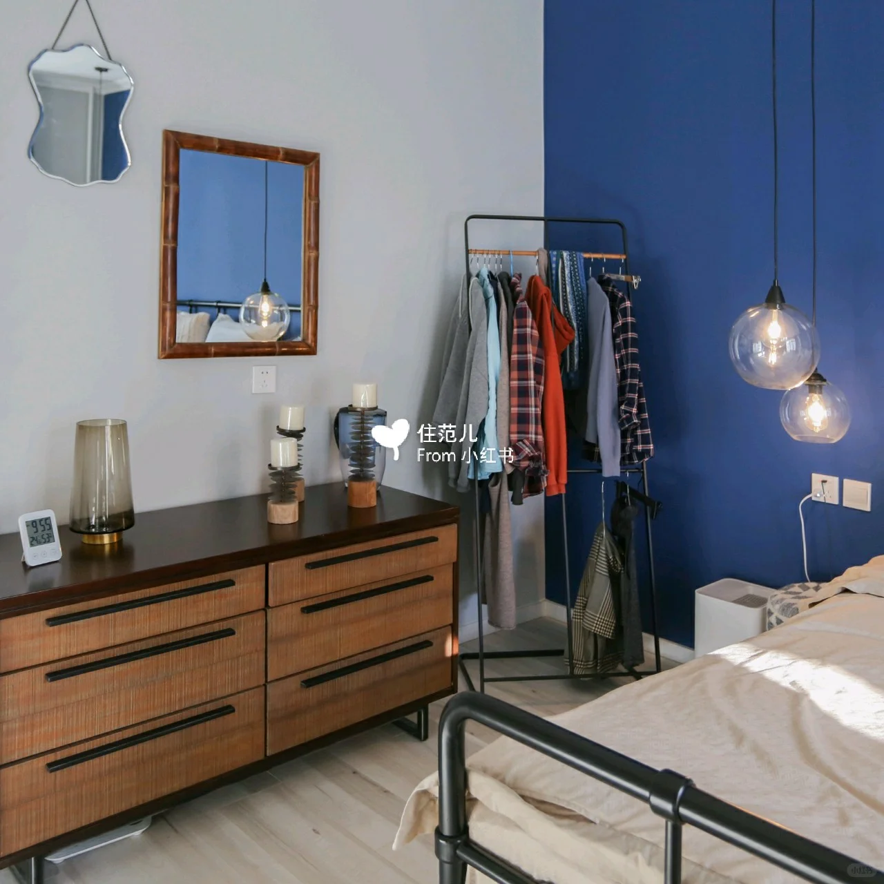熟悉的小伙伴都知道,我們很早之前就在說先定軟裝,再定硬裝。這次拜訪的客戶W就是遵循著這個原理。 . 墻漆 窗簾 她是先選好家具又定的藍(lán)色墻漆,原來還擔(dān)心會比較暗,刷上墻后發(fā)現(xiàn)完全沒有必要擔(dān)憂。房子南北通透,光線很足。于是窗簾就選了跟墻漆一樣的顏色,效果也很棒。 . 床墊:舒達(dá) 床墊是臥室里最貴的家具,將近一萬。W試睡過很多家后找到的,是很知名的牌子哦。 床架:ink ivy 其實最先定下來的家具就是床架,一直都很喜歡這個,去線下門店一眼相中的。 . 吊燈:景聯(lián)燈具 平時在臥室就是睡覺,并不需要特別亮的光線,就沒有安主燈,床頭的兩頂?shù)鯚舫袚?dān)照明功能。 . 收納柜:ink ivy 這個抽屜式收納柜,放置折疊的小衣物,下面腿離地比較高,方便掃地機(jī)器人出入。 . 衣架:山崎實業(yè) 平時穿一兩天不想洗的衣服掛在臥室的衣架上,能容納一周的衣物替換需求,也能跟干凈衣服區(qū)分開。