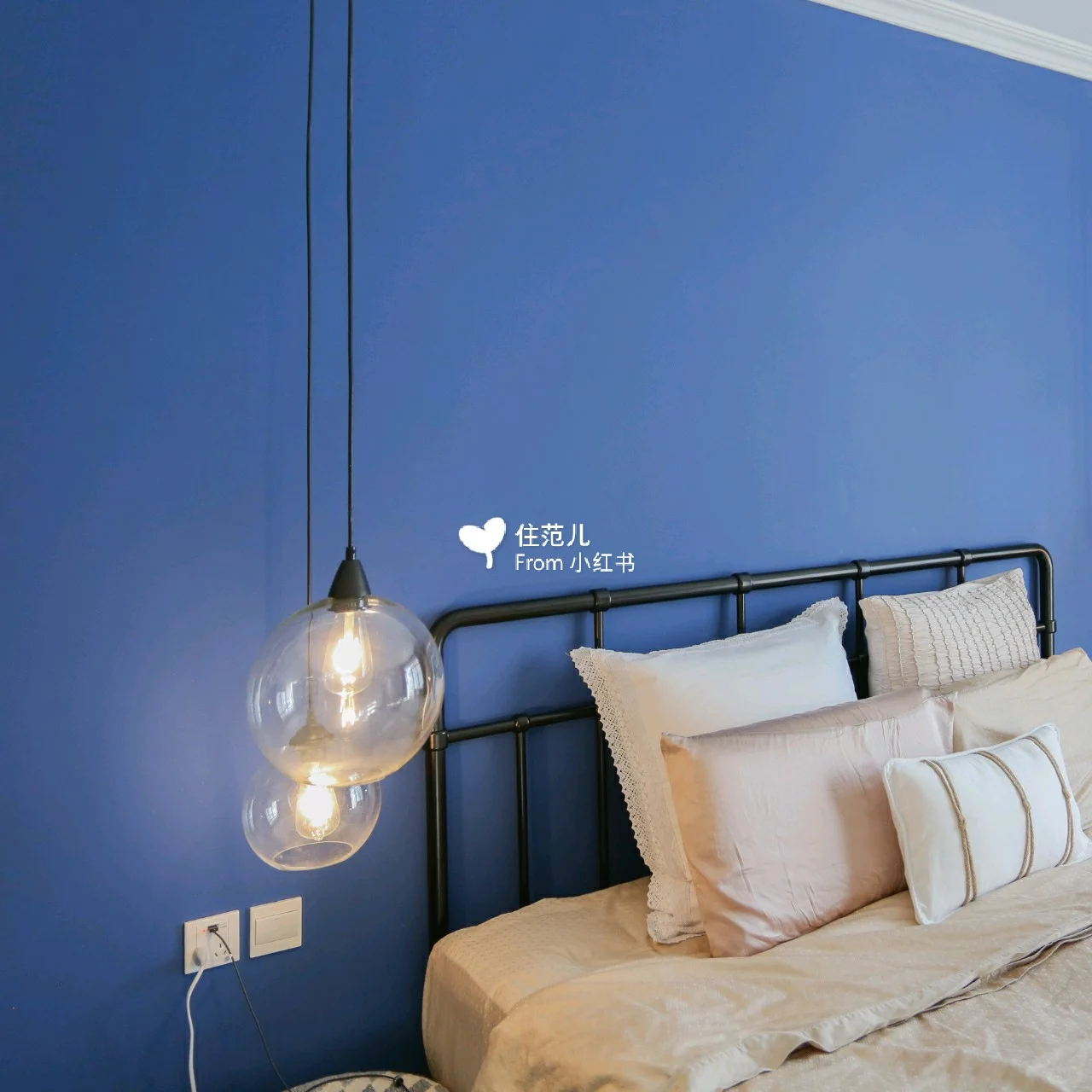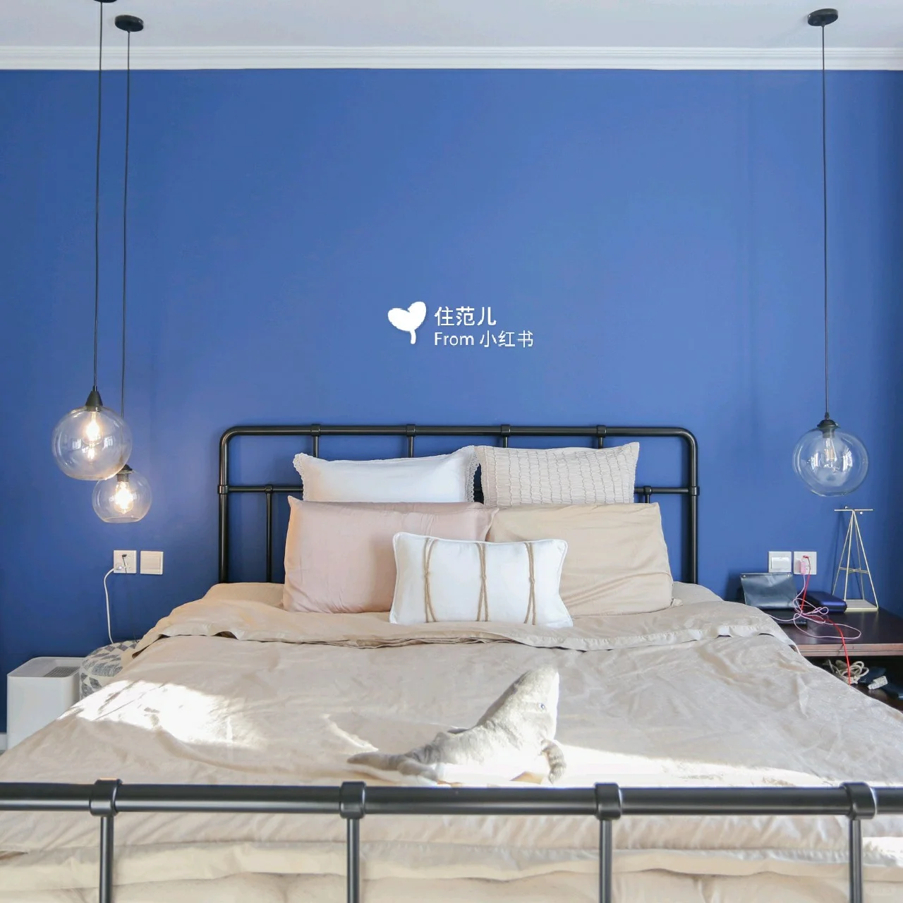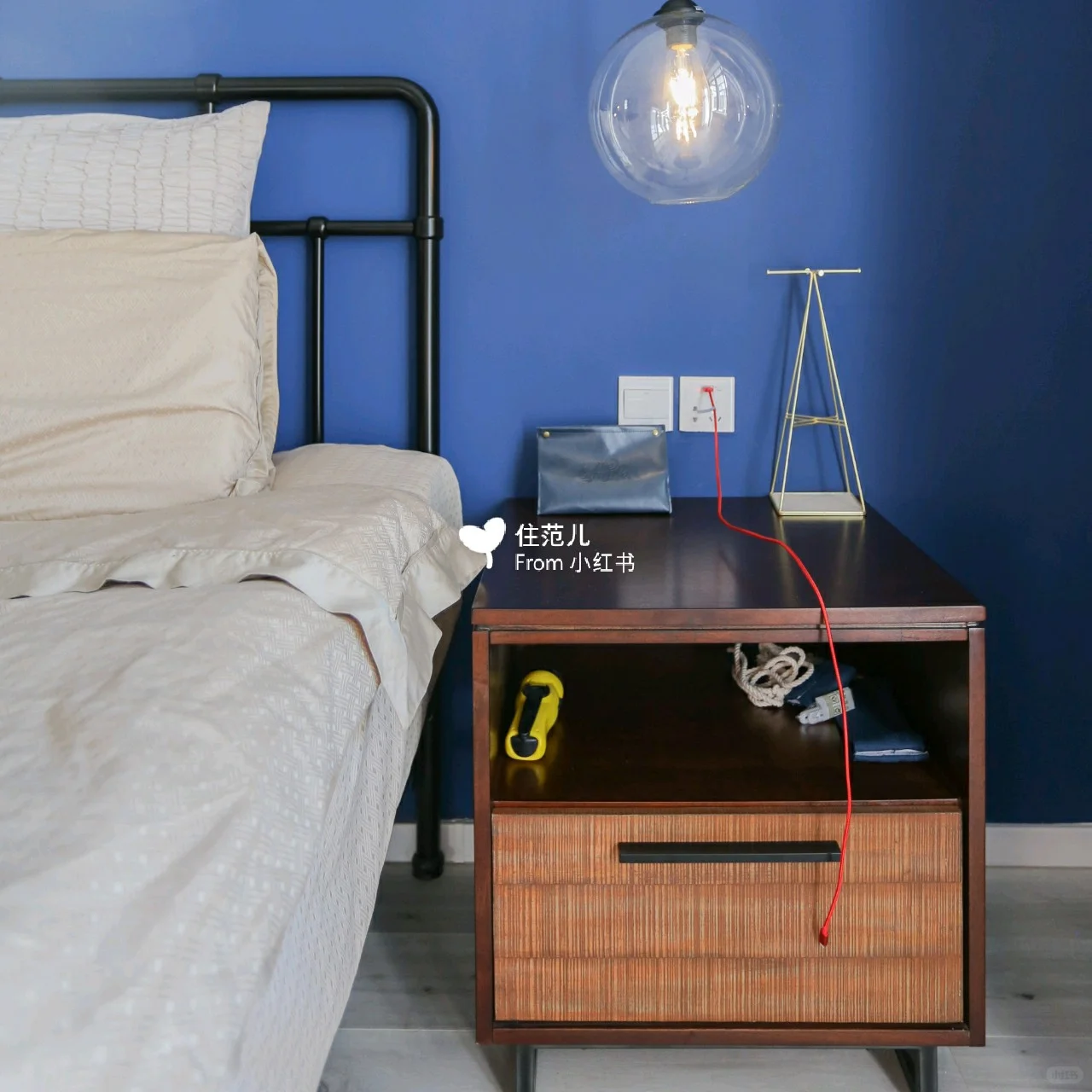 熟悉的小伙伴都知道,我們很早之前就在說先定軟裝,再定硬裝。這次拜訪的客戶W就是遵循著這個原理。 . 墻漆 窗簾 她是先選好家具又定的藍(lán)色墻漆,原來還擔(dān)心會比較暗,刷上墻后發(fā)現(xiàn)完全沒有必要擔(dān)憂。房子南北通透,光線很足。于是窗簾就選了跟墻漆一樣的顏色,效果也很棒。 . 床墊:舒達(dá) 床墊是臥室里最貴的家具,將近一萬。W試睡過很多家后找到的,是很知名的牌子哦。 床架:ink ivy 其實最先定下來的家具就是床架,一直都很喜歡這個,去線下門店一眼相中的。 . 吊燈:景聯(lián)燈具 平時在臥室就是睡覺,并不需要特別亮的光線,就沒有安主燈,床頭的兩頂?shù)鯚舫袚?dān)照明功能。 . 收納柜:ink ivy 這個抽屜式收納柜,放置折疊的小衣物,下面腿離地比較高,方便掃地機(jī)器人出入。 . 衣架:山崎實業(yè) 平時穿一兩天不想洗的衣服掛在臥室的衣架上,能容納一周的衣物替換需求,也能跟干凈衣服區(qū)分開。